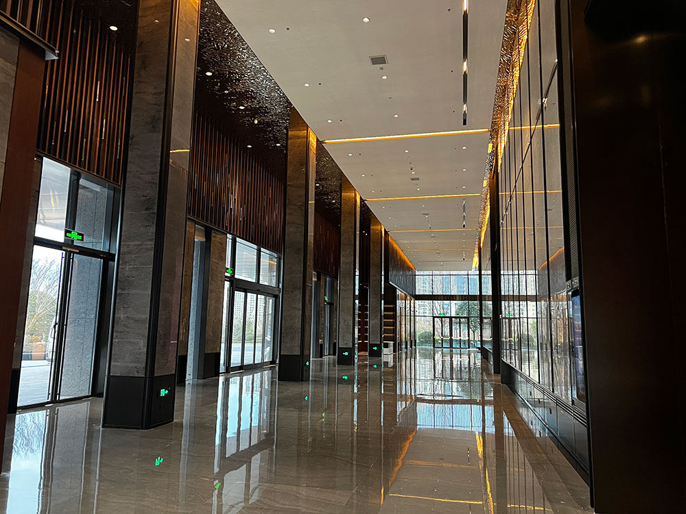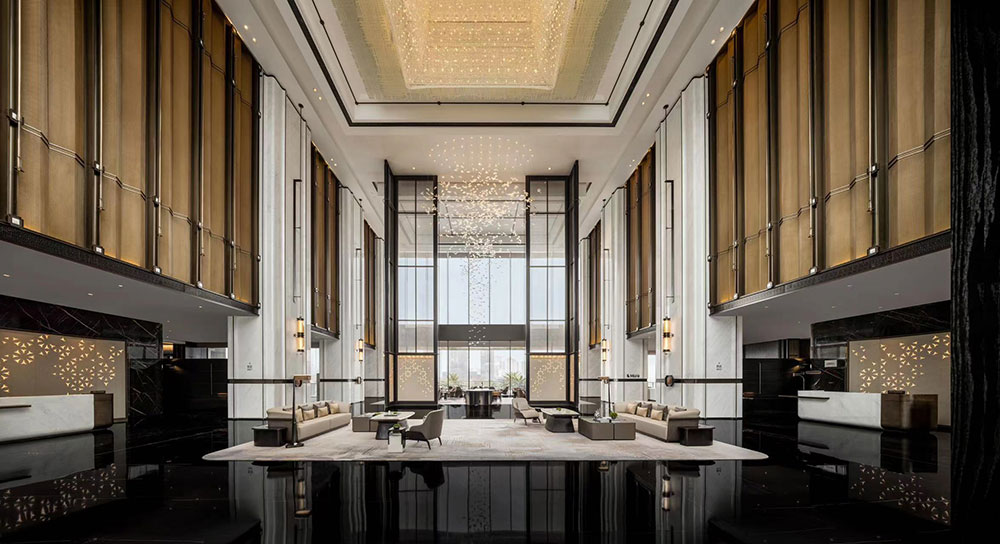 Sheraton Ninghai Hotel is unique through a series of newly upgraded design elements with brand characteristics and the use of stainless steel materials. The lobby is magnificent, with grille glass one after another, matte surface treatment, combined with lighting, like mountains, projecting a Philosophy about "Mountain".